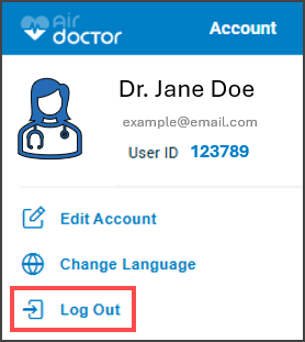Use the Log out confirmation screen to end the current session in the Air Doctor app.
