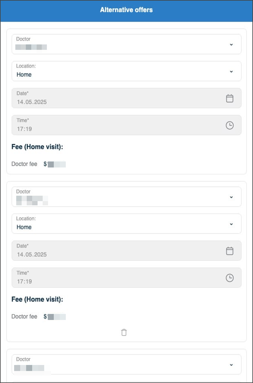 - Preselected doctor and location values in each alternative where the request includes defaults.