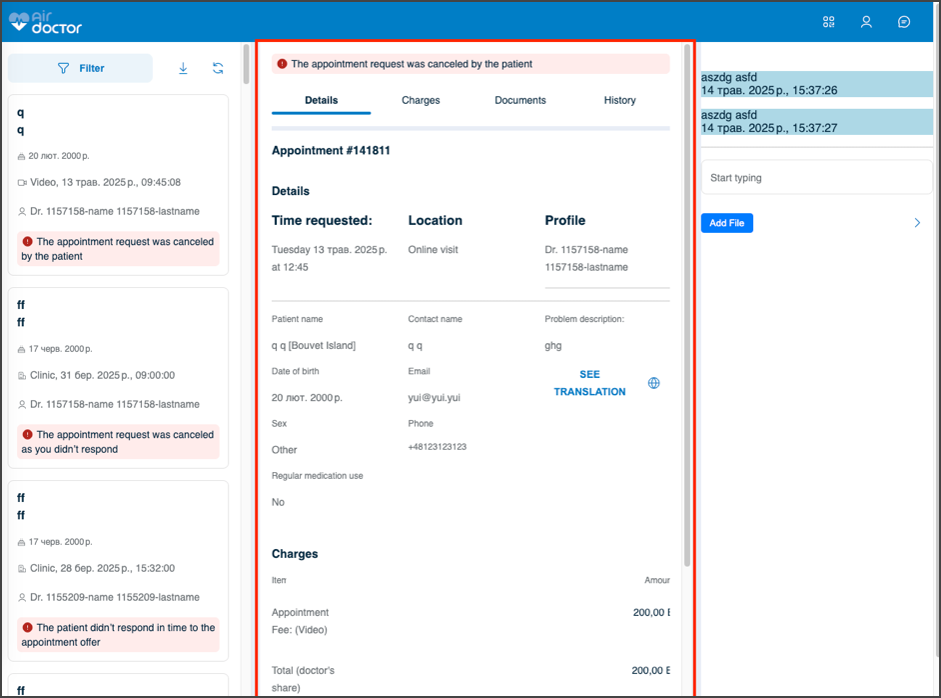 This screen presents appointment metadata, financial information, attached documents, and status history for an authenticated doctor.