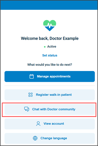 - From the navigation bar or chat panel, select Chat with Doctor Community.