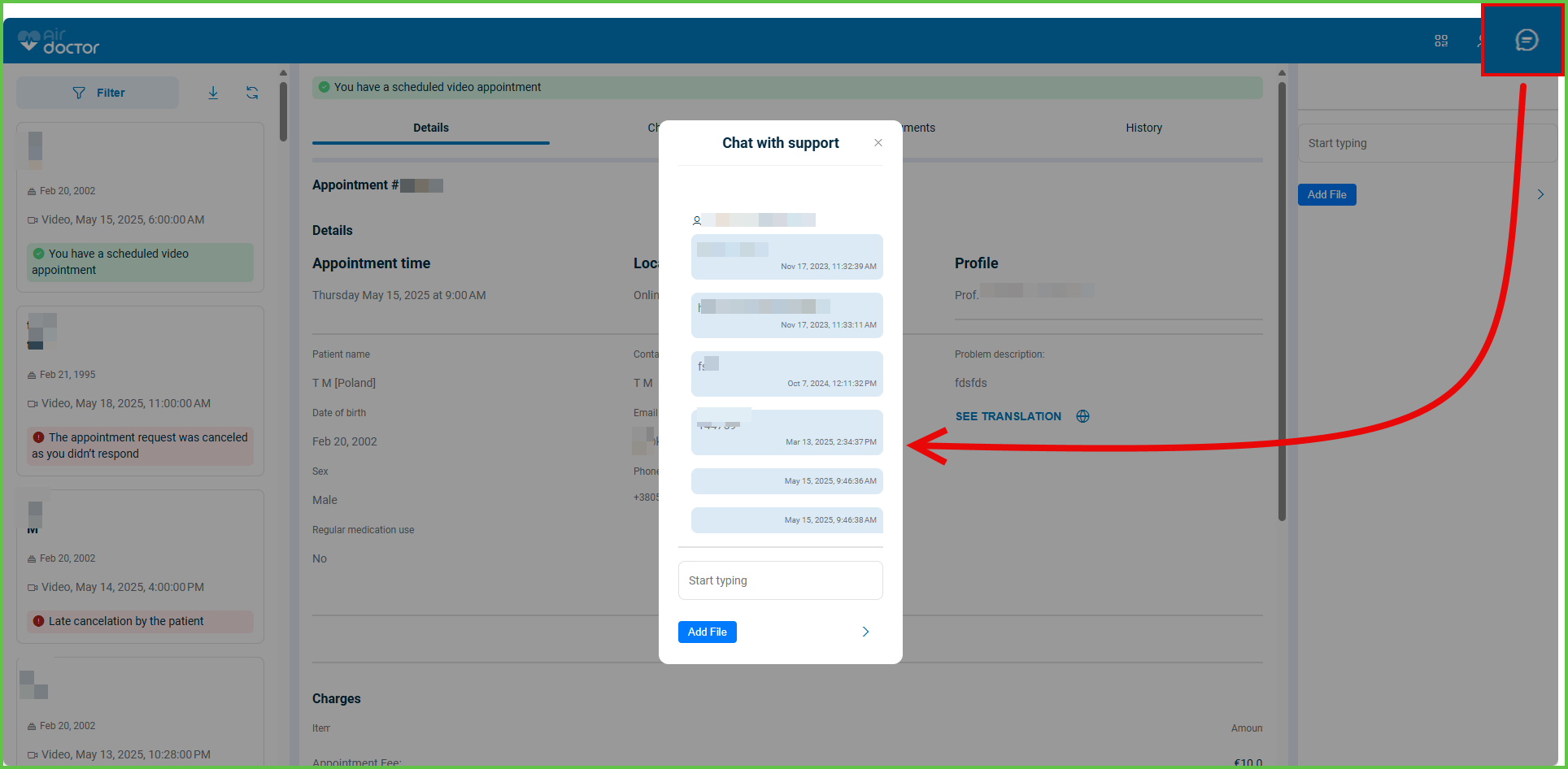 Use the Chat screen to exchange secure messages between doctors and Air Doctor support.