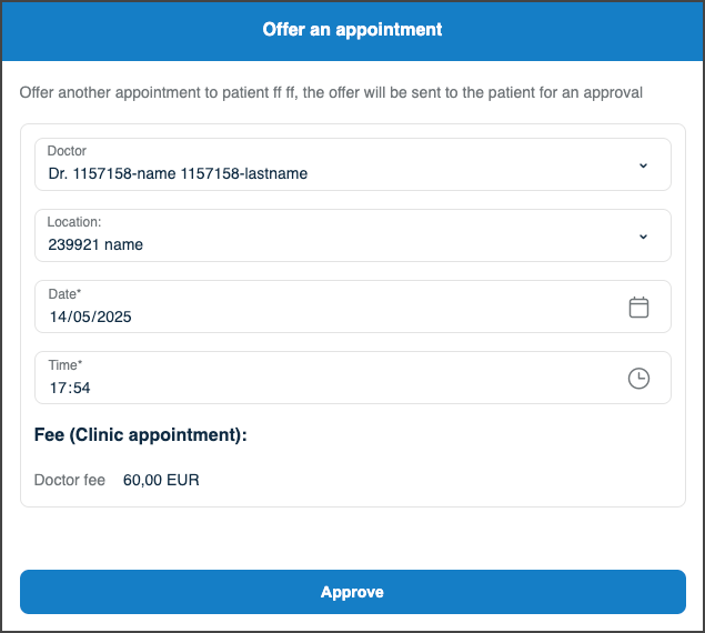 | The doctor submits a valid offer. | The app sends the offer and navigates to appointment history. | Server-side confirmation; subsequent page responses reflect the new offer state. | — |