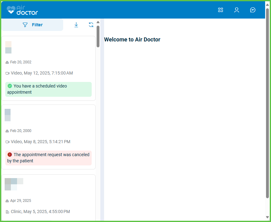 - The right pane displays the Welcome Screen until the doctor selects an appointment.