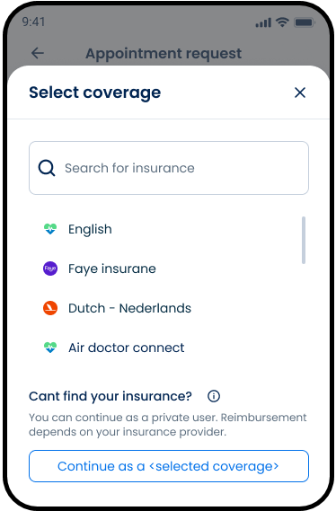 The response contains a searchable list of insurance providers, selectable coverage options, and a primary action that submits the selected coverage.