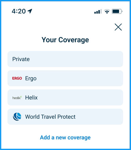 Select an insurer, select Add Coverage, or select a private-pay option.