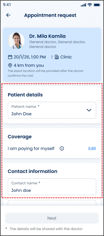 The selected patient defines the identity details shared with the doctor during the appointment flow.