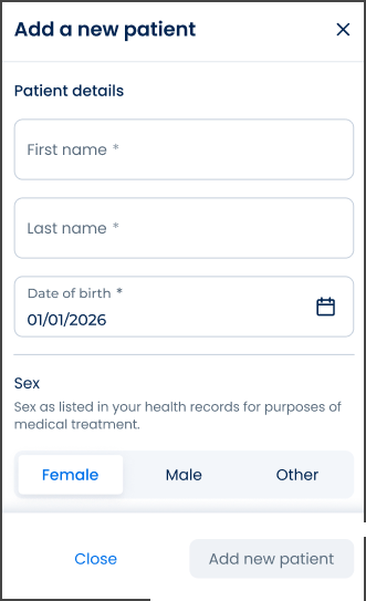 Use the Patient details section in the Appointment request screen to select or add a patient profile.