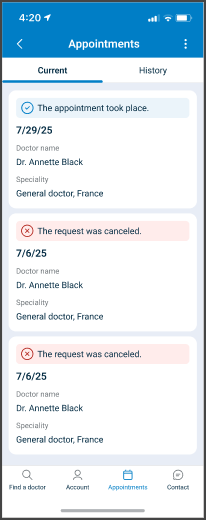 Use the Appointment List screen to view appointments for the current patient. Each card displays doctor details, visit information, status, and available actions.