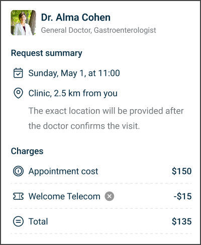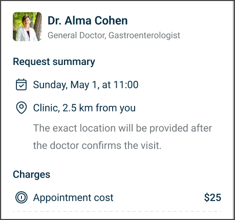 - Doctor details that show the doctor name, profile image, and medical specialty.