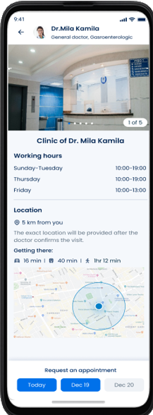 - From the doctor details screen or clinic list, the client provides a valid