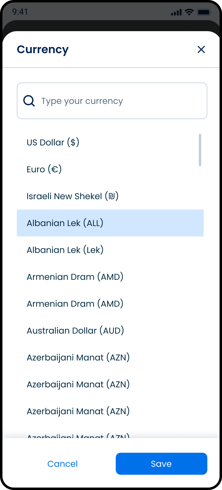 - Modal interface for selecting a currency.