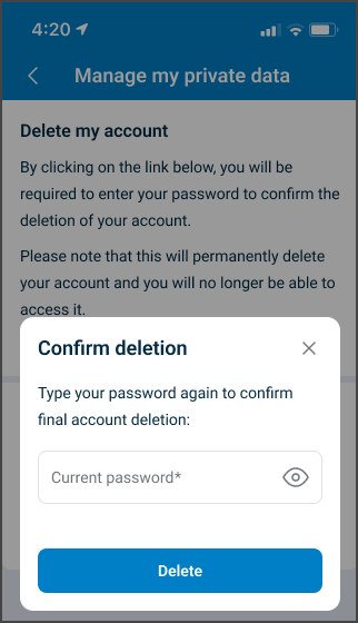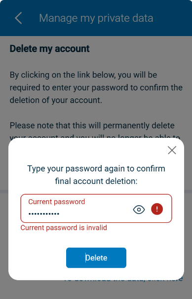 Use the Delete Data and Log in Again screen to confirm account deletion with password verification.