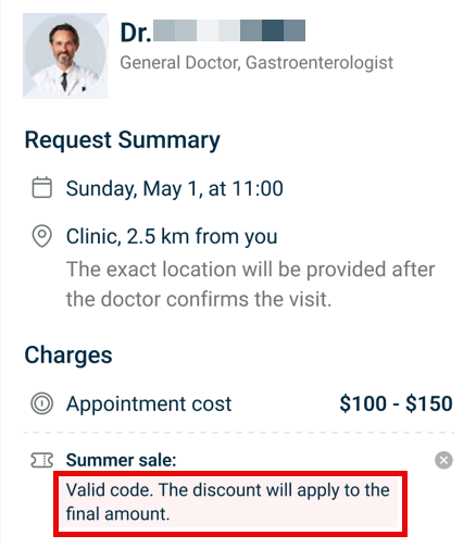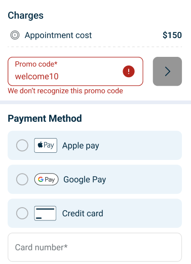 Use the Discounts and Promotions screen to enter, validate, and apply promo codes during appointment booking.