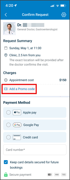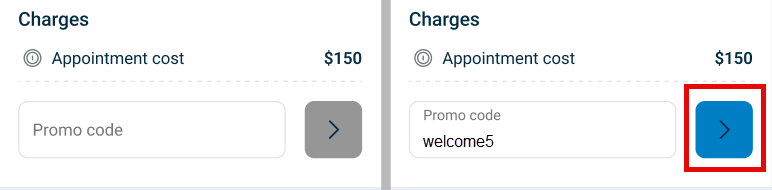 The promo code field appears only when the appointment configuration allows promo codes for the current user and payment type.