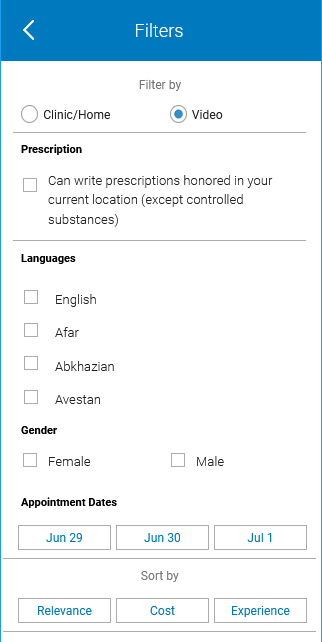Use the Filter screen to refine doctor search results by visit type, availability, and preferences.
