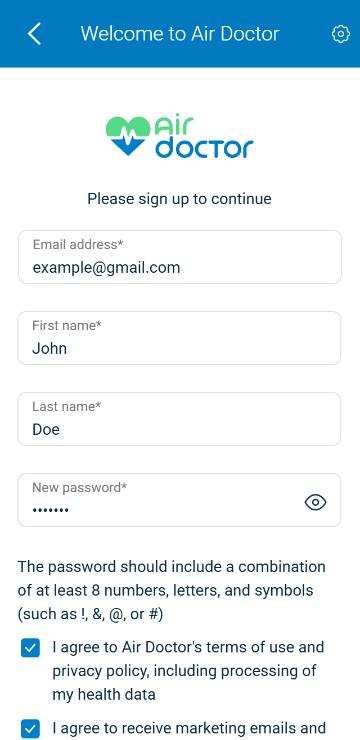 Use the Create Account screen to register a new patient in the Air Doctor app.