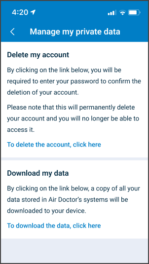 Use the Manage My Private Data screen to download personal data or permanently delete an account.