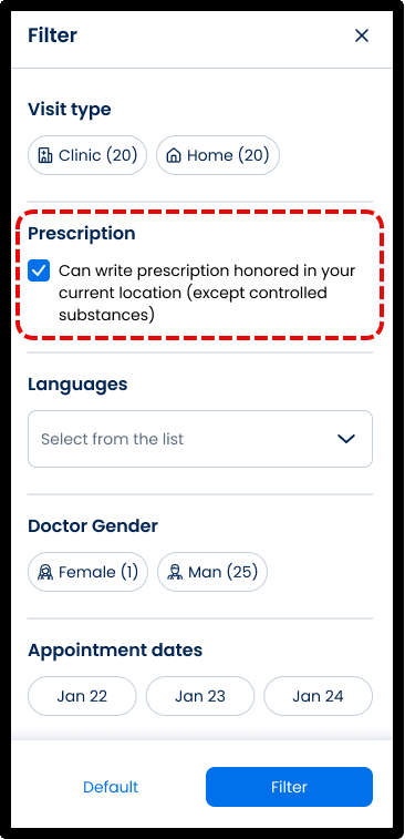 | Prescription filter enabled | Display only doctors eligible to prescribe in current location. |