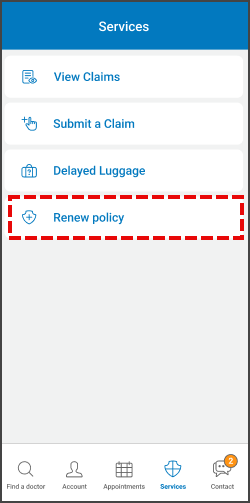 The list includes Find a Doctor and any additional insurer services, such as Renew Policy. -