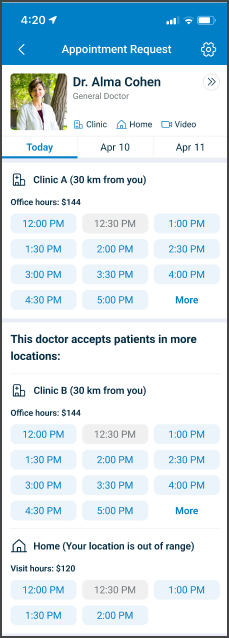 - A doctor card that shows the provider name, specialty, and supported appointment types.