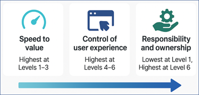 - Time to market - Levels 1-3 suit fast enablement. Higher levels require more effort but provide tighter integration and a smoother user journey.