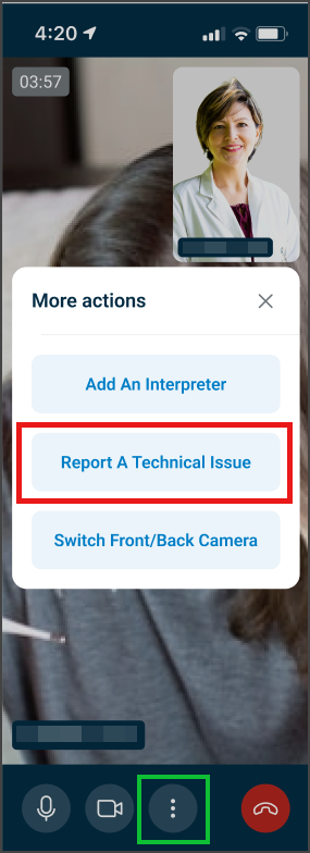Use Technical Issues to report audio, video, or connectivity problems during an active video consultation.