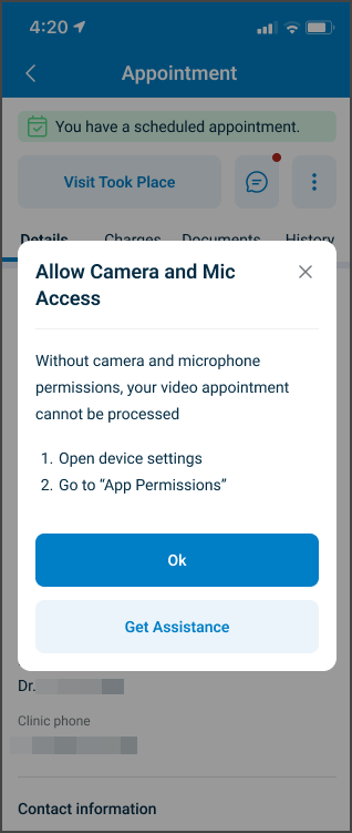 Use Permissions and Device Access to manage camera and microphone authorization before starting a video appointment.